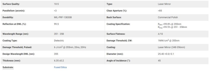 25.4mm Dia. 355nm 45°, Nd:YAG Laser Line Mirror